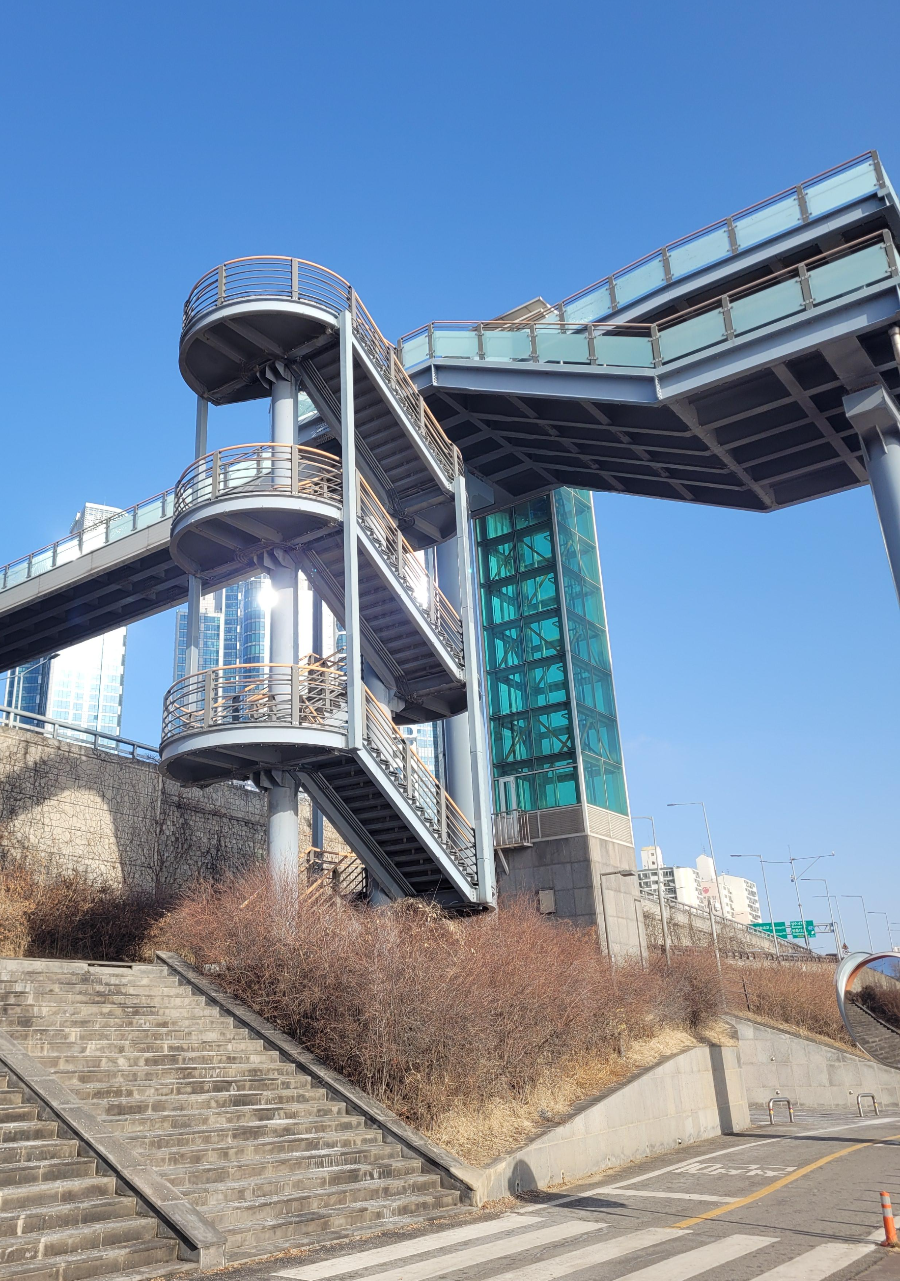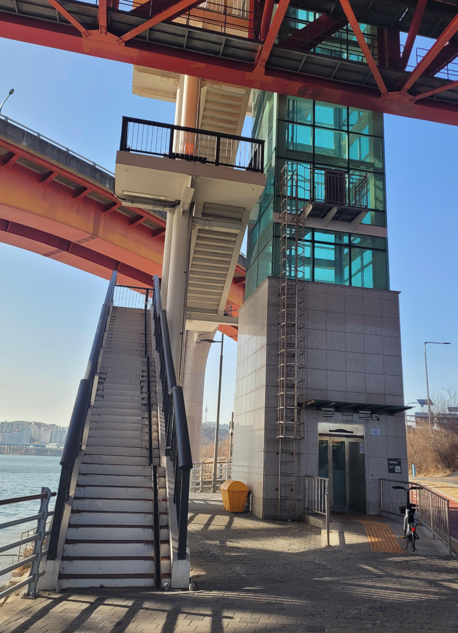 이 지점은 성수대교를 걸어서 강 남쪽으로 건널 수 있는 엘리베이터와 계단이 있습니다. 물론 자전거도 같이 탑승이 가능하니 자전거로 한강 건너길 원하시는 분들은 이용하면 좋을 것 같습니다.